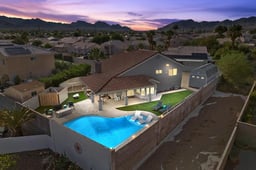 Welcome to this sweet split-level home offering 2,022 sqft of living space on an expansive 9,583 square foot lot in Henderson w/ NO HOA. This property has been upgraded inside & out, including a resort-style backyard w/ a new pool featuring waterfalls & updated patio concrete|decking. The 900 sqft garage is equipped with a new Mini Split AC, LED lighting, epoxy flooring, new diamond plate trim, upgraded garage door openers w/ extra security locks, & a 50-amp outlet for welding.—Inside, you’ll find fresh paint on the kitchen and bathroom cabinets incl doors & trim, new flooring on the main level, a completely remodeled master bathroom, & ceiling fans throughout. Additional highlights include a newer AC unit, tankless water heater, washer & dryer, & a new Mini Split in the office (3rd Bedroom). The home also features window tinting, modern shutters, ss appliances, brushed nickel hardware, and two Tuff Sheds 10X12. TVs attached to the walls are included, and furnishings are negotiable.