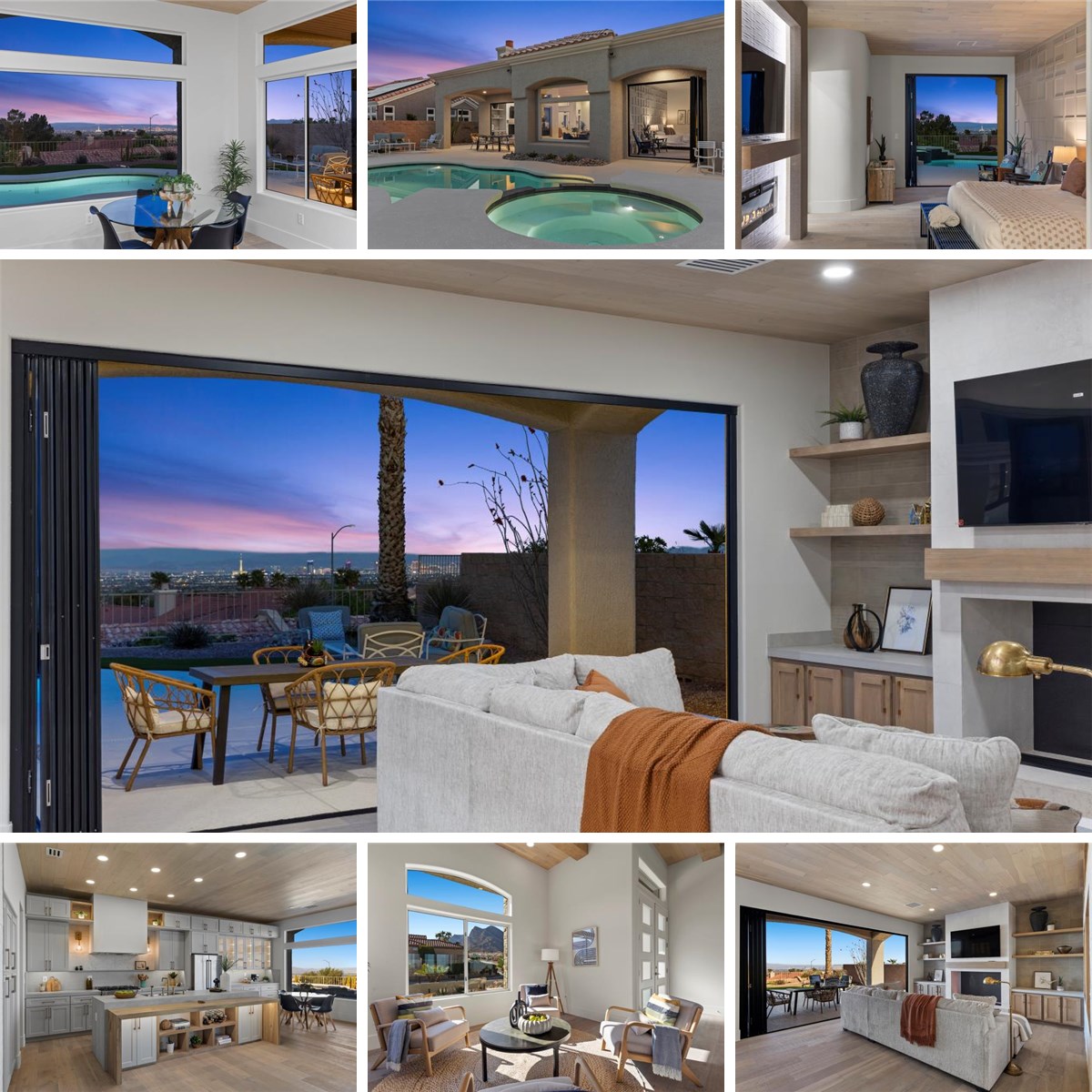 Premium design meets the ultimate 55+ lifestyle in this stunning Sun City Summerlin home. Enjoy iconic Strip views from the primary suite, kitchen, family room & backyard, while the front of the home captures breathtaking desert sunsets. Every detail has been thoughtfully curated, from the modern water-vapor fireplace & premium white oak engineered hardwood floors to custom wood-accent ceilings & designer walls that elevate the style throughout. At the heart of the home, the chef’s kitchen is a true showpiece with a spacious island, sleek quartz counters & open layout—perfect for entertaining or relaxing. A 15-ft panoramic sliding door of individual panels creates seamless indoor/outdoor living with twinkling city lights as your backdrop. Sun City Summerlin offers world-class amenities: 4 clubhouses, 3 golf courses, fitness center, pools, pickleball, social clubs & more. With shopping, dining & freeway access nearby, this home delivers the best of Las Vegas living.