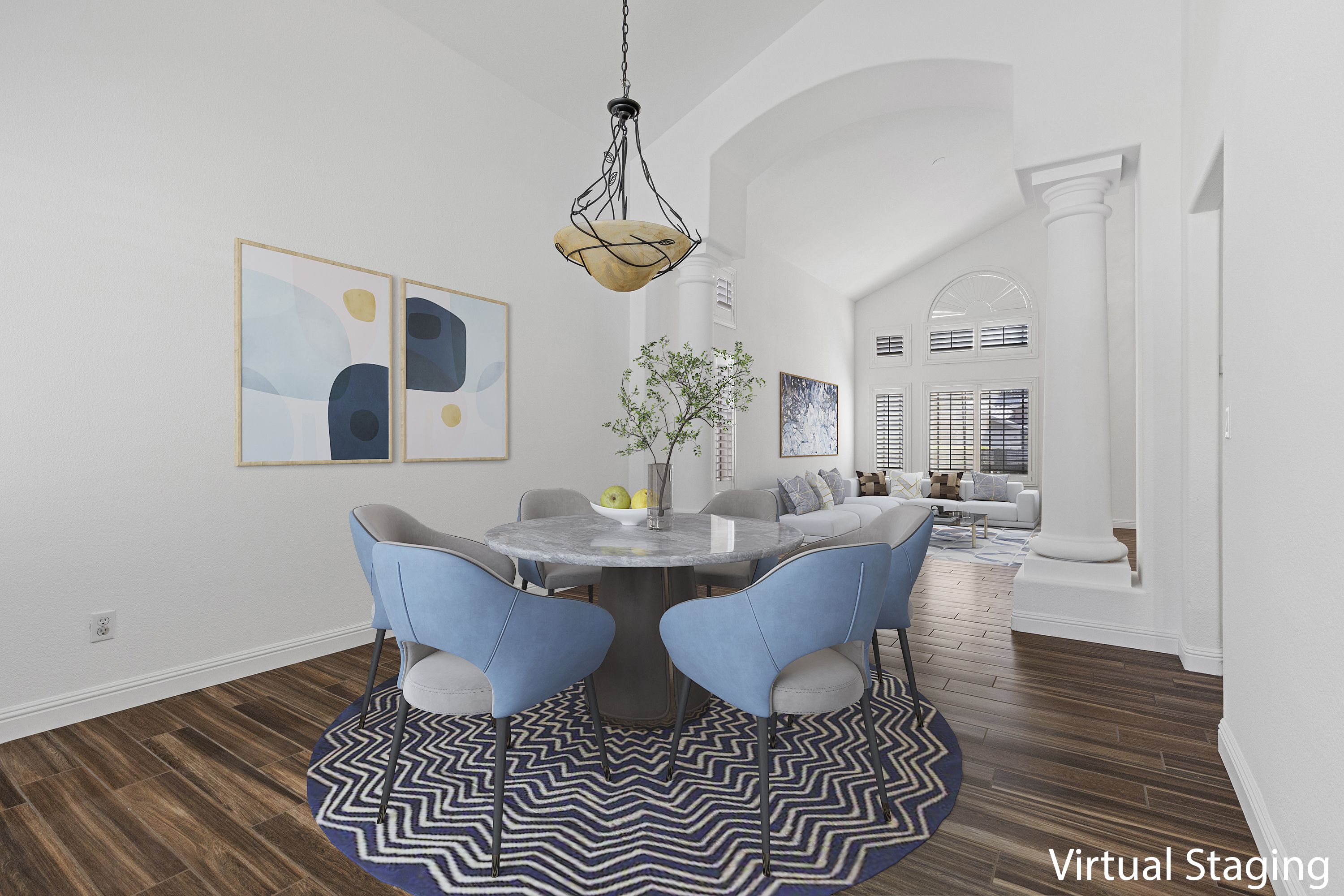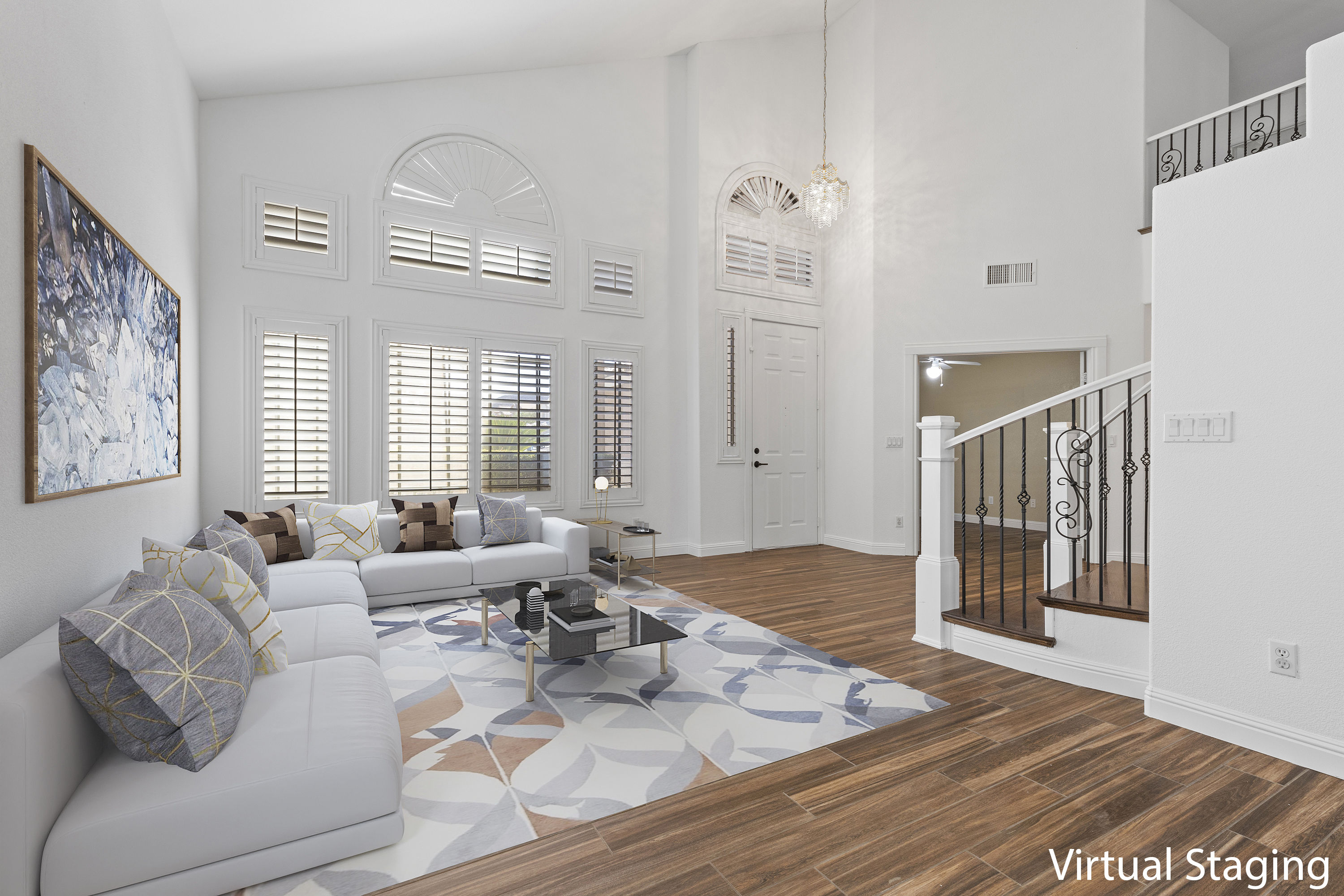Discover your dream home at this beautiful 2-Story home spanning 3,597 square feet of living space. This home features 5 bedrooms, 4.5 bathrooms, a den which can be used as an office, a formal living room and a formal dining room. Lots of upgrades throughout including new staircase, carpet in upstairs bedrooms, wood like tile flooring, kitchen cabinetry, bathroom cabinet and sinks. The primary bedroom is a true retreat with vaulted ceiling, sliding glass door to balcony that has strip views and an updated spa like ensuite bathroom. The living room is prewired for a surround sound system and has a cozy fireplace. Relax by the sparkling pool with swim jets, unwind in the spa or practice your golf hits on your own putting green. Enjoy easy access to groceries, shopping, and dining options. This home is a must see!