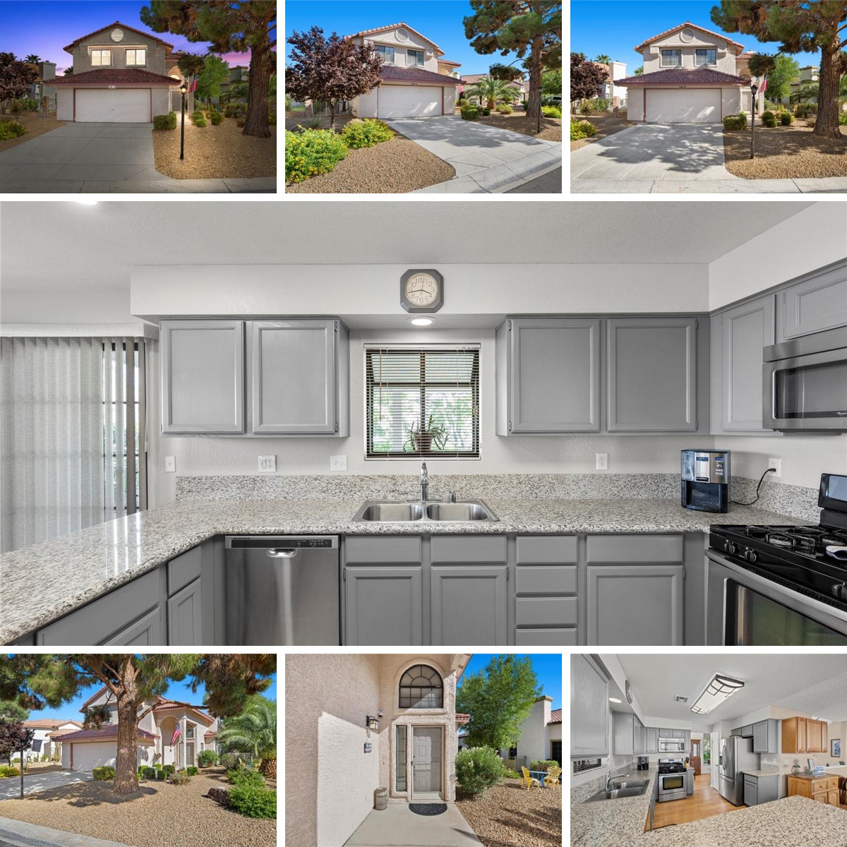 Welcome to this charming two-story home in the coveted guard-gated Los Prados community. The kitchen boasts granite counters, stainless appliances, a garden window and a cozy breakfast nook. Three bedrooms upstairs keep the main living area open for entertaining or relaxing by the fireplace. Beautiful laminate wood flooring adds elegance and easy care. A separate laundry room with abundant cabinetry offers extra storage. Enjoy low-maintenance desert landscaping, a covered backyard patio for unwinding, and a garage complete with workbench and ceiling storage. This home blends style and functionality in one of Las Vegas’ most desirable communities—don’t miss your chance to see it!
