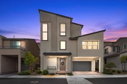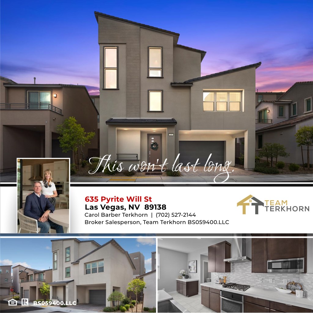 Stunning newer home in Summerlin w Strip & Mountain views! Dual primary suites on separate floors, 3 Terraces & private enclosed yard w/ elevated garden area. Paver driveway, walkway, & back patio, front porch. Oversized 2-car garage w/epoxy floors, storage, 220V EV outlet & rare covered carport. Soaring vaulted ceilings in the great rm, open dining area with covered terrace, quartz counters, serving bar & upgraded cabinetry. Gourmet kitchen w/GE Profile gas cooktop with griddle, built-in oven, microwave, walk-in pantry, island—fridge included. Both primary suites offer walk-in closets, en-suite baths w/ dual sinks & large showers. Third-floor suite has open-air deck w/mountain views. Ground-level media room prepped for surround sound, ceiling projector & more, 8 Ft sliders to covered terrace, Powder Bath. Great Flex Space, office or over flow guest. Upgrades Galore! Laundry w washer/dryer included, Tile Flooring in Common Areas & Tankless Water Heater. Perfect Location! Also for sale.